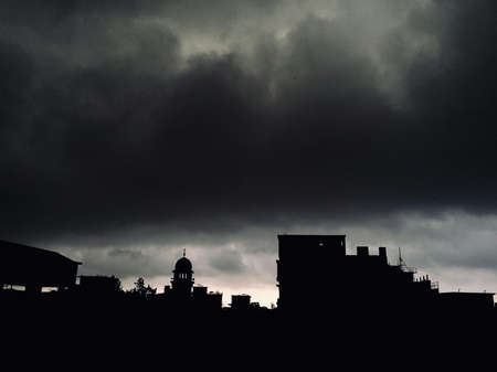 Dark storm dramatic clouds over big city. Moment before rain and wind.
