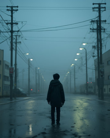 Wistful Solitude Anime Style Silhouette in Foggy Parking Lot