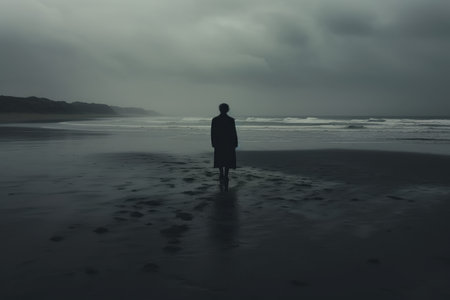 A person standing on a beach next to the ocean, A lone figure silhouetted against a black horizon
