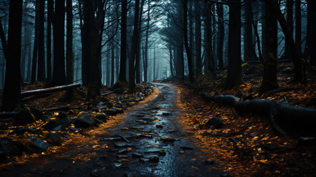 dark and mysterious forest with towering trees, a misty atmosphere, and a sense of foreboding. AI Generative