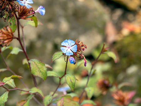 Little blue flower and green leaves of Ceratostigma plumbaginoides, Chinese plumbago