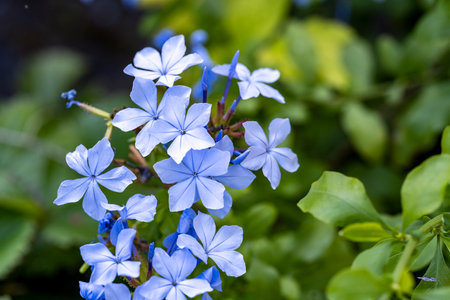 blue Plumbago auriculata plant with plenty of flowers outdoor in harsh light surrounded by dark moody tones