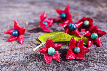 unusual red flower on a wooden base with green leaf, note shallow depth of field
