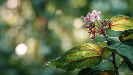 A detailed photograph of a single Clerodendrum, swaying gently in the wind, captured in natural daylight. Fresh and airy atmosphere, soft motion blur on leaves, crisp details on textures, background softly blurred into natural greenery, cinematic natural light, realistic photography style.