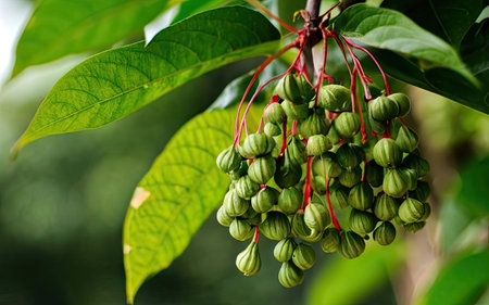 Tropical plant with flowering red blossoms with seed pods that look like berries.