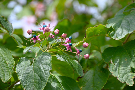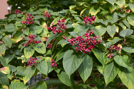 Harlequin glory bower flowers.Lamiaceae deciduous plants.The flowering season is from August to September. The young leaves are edible and the berries are used for vegetable dyeing