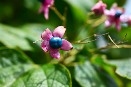 The white flowers bloom in summer and contrast beautifully with the red sepals of the ripe indigo berries in autumn.