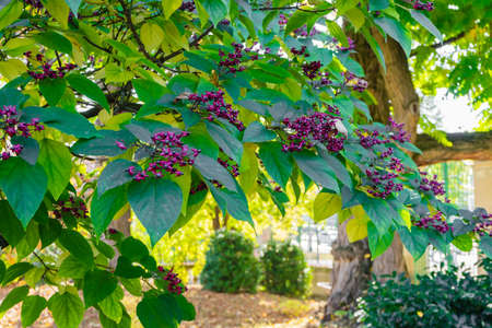 The Clerodendrum in summer, Bright sunlight pierces dense foliage, the air feels hot, natural color