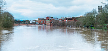 Significant flooding from rain water pouring into the Severn river, from surrounding hills and countryside after bursting riverbanks, prolonged winter,New Year precipitation from storms.