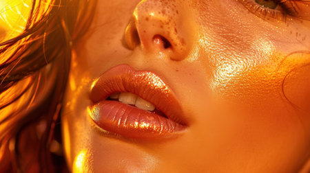 Close up portrait showcasing radiant skin with glossy finish, highlighting natural freckles and full lips. warm golden light enhances beauty and creates inviting atmosphere