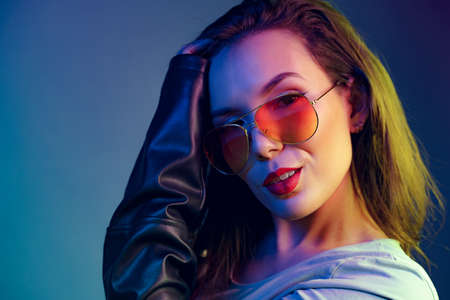 Asian girl in sunglasses and black leather jacket posing against dark blue background