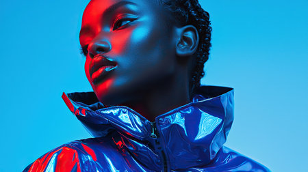 Model poses in vibrant blue jacket against bright red background during a fashion shoot