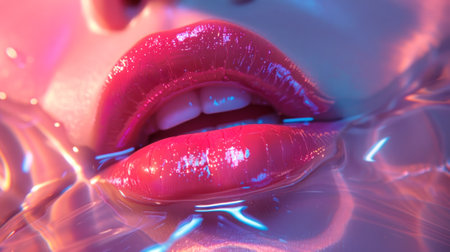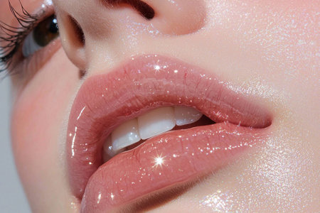 Close-up of glossy lips with a shimmering effect, highlighting beauty and skincare trends, emphasizing hydration and makeup artistry.