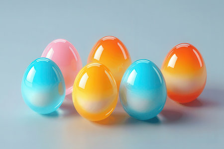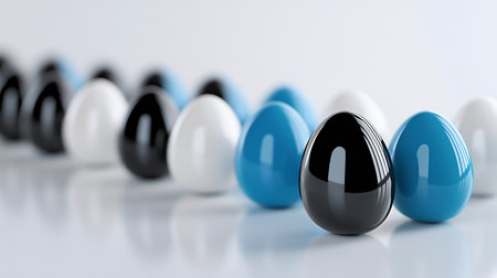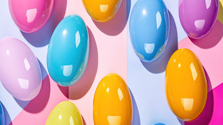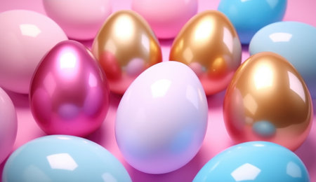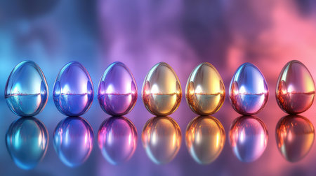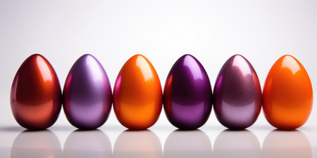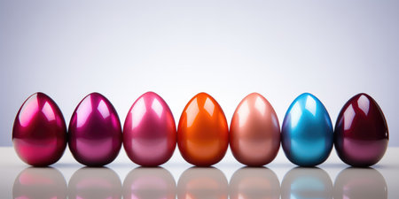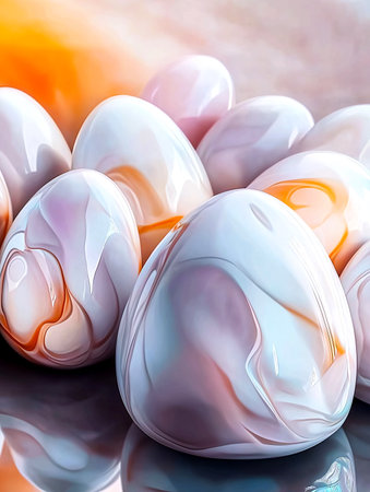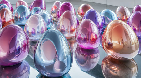 Gourmet painted eggs, reflective Easter decor, glossy egg surfaces, luxury culinary presentation, high-end festive styling, elegant Easter art, mirrored egg photography, upscale holiday composition, symmetrical egg display, premium glossy textures, gourmet festive decor, luxurious holiday visuals, egg-focused aesthetics, high-class Easter art, precise reflective styling, modern festive sophistication, sleek holiday design, artistic culinary eggs, polished egg textures, glamorous Easter photography