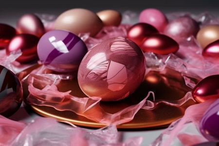 Beautiful colorful composition with chocolate easter eggs richly luxuriously decorated on a crystal surface and pink colors. Generative AI. High quality illustration