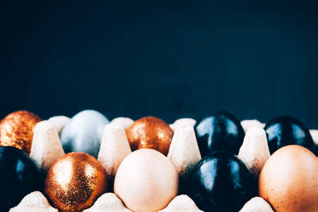 Naturally dyed black, blue, gray, beige, golden Easter eggs pattern. Close-up of egg carton.