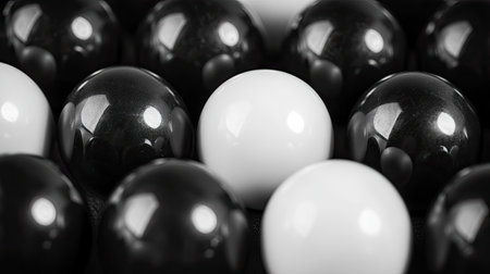 This close-up image features a striking arrangement of black and white glossy marbles reflecting light beautifully on a dark surface. The minimalistic design captures the elegance of contrasting colors and textures.