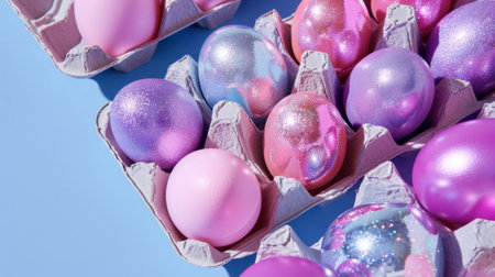 A vibrant assortment of pastel Easter eggs presented in a carton, showcasing sparkling details. Perfect for springtime decoration and celebrations.