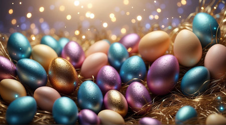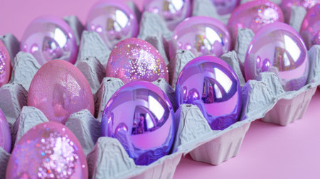 A vibrant arrangement of glittery Easter eggs in shades of pink and blue rests in a carton, set against a dreamy bokeh background, symbolizing celebration.