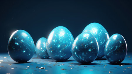 Blue easter eggs with golden confetti on blue background 3D rendering