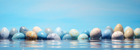Minimalist easter banner featuring an array of pastel eggs arranged in a balanced flat lay against a white backdrop. the soft colors and clean design offer an elegant look, ideal for seasonal greetings, promotions, or digital content.