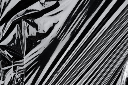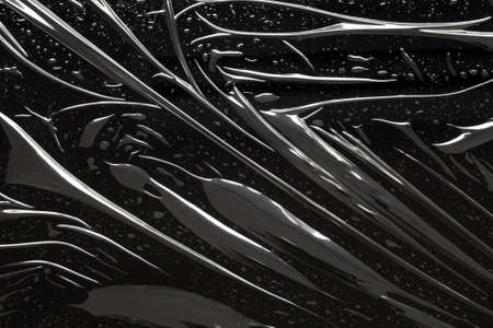 Transparent plastic wrap texture on the black background. Plastic bag texture. Reusable trash and waste.