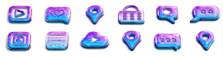This image showcases a collection of digital icons in a vibrant color scheme of purple and blue. The glossy finish gives them a modern look. These icons, representing different functions and concepts, would be useful for various commercial applications and design projects. The composition is simple and isolated, making them adaptable for different contexts.