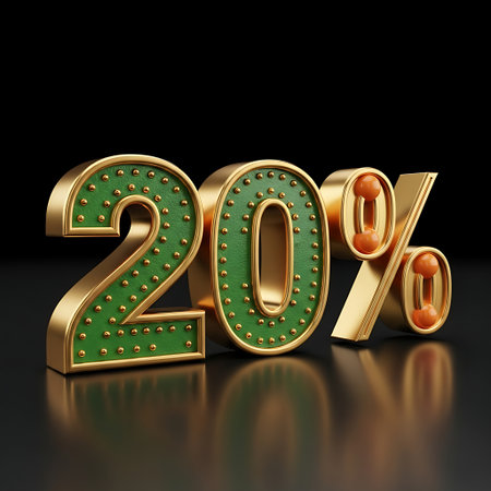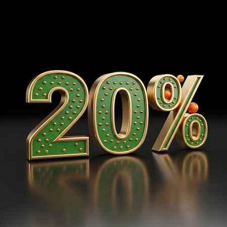 3D render of green 20 percent numbers with gold trim and gold studs, on a reflective black surface. 20 percent, discount, sale. 20 percent discount green gold 3d render...