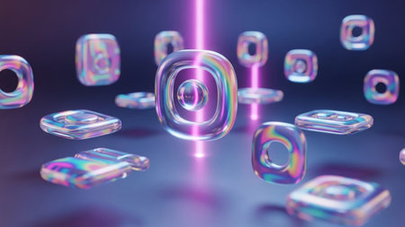 Various rounded geometric shapes with a holographic iridescent sheen float in a dimly lit environment with neon purple and blue lighting.