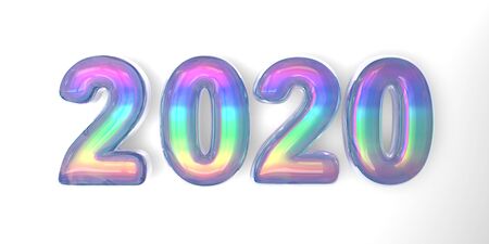 3D text of the letter 2020 year in the style of soap bubbles with a rainbow tint on a white background