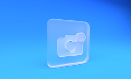 Frosted glass camera and gear icon isolated on blue background. Adjusting app, service concept, setting options, maintenance, repair, fixing. Square frosted glass button. 3D render illustration.