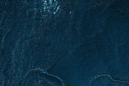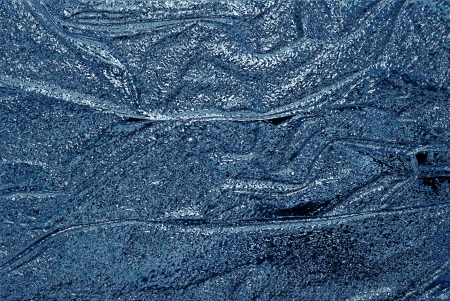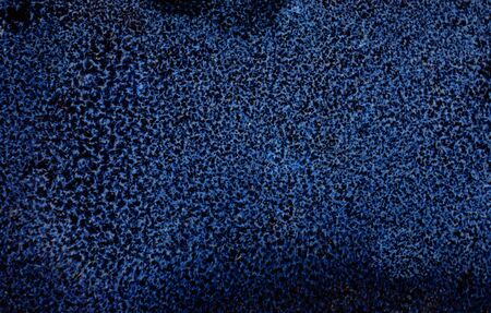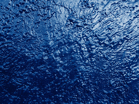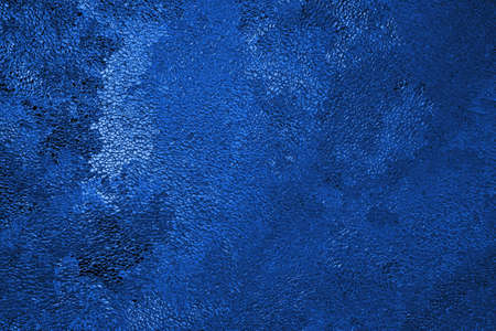 Deep blue winter background or wallpaper. Rich saturated bright color. Tinted grainy backdrop in dark and light tones. Surface of ice crystals close up. A pattern of chaotic spots. Macro