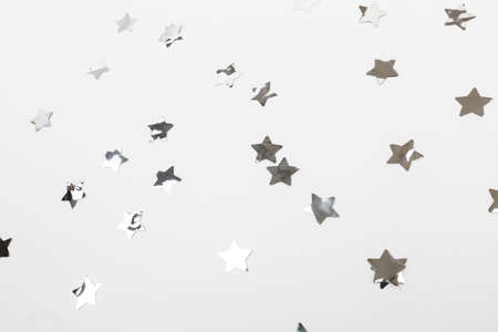 star silver confetti on white background flat lay text place - Image