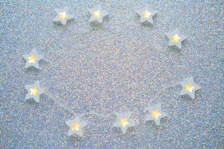 A silver stars confetti frame adorns a banner, creating a shimmering and glamorous scene with plenty of copy space.