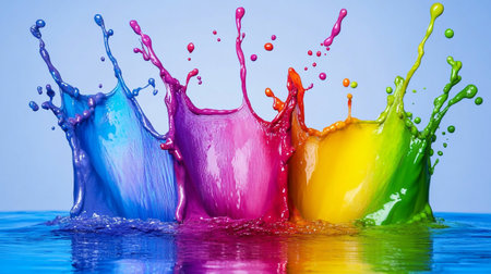 Dynamic Paint Splash Explosion in Motion A high-speed capture of vibrant acrylic paint splashing mid-air in bold primary colors, frozen