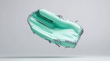 A mint green baseball glove is suspended in mid-air against a soft, light-colored backdrop, showcasing its design.