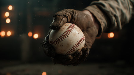 This close-up image captures a hand gripping a baseball, showcasing the intricate textures of the ball and glove in a moody, atmospheric background perfect for sports-themed projects.