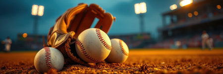 Baseball glove and balls resting on the infield at dusk during a game at a baseball stadium