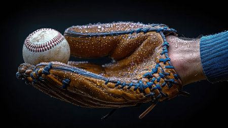 A classic aged baseball mitt cradles a scuffed ball, set against a dark studio backdrop. The rugged leather and soft spotlight evoke timeless sports nostalgia and macro-detail.
