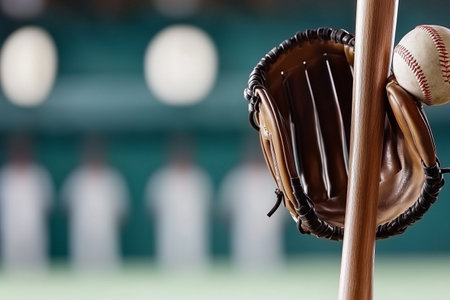 A detailed view of a baseball glove and bat positioned on a field, capturing the essence of the game. Players appear blurred in the background, emphasizing the focus on the equipment.