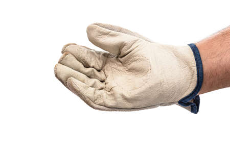 Worker showing gesture - fist. Male hand wearing working glove, isolated on white background.