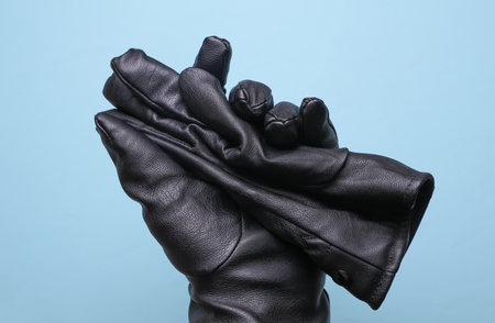 Hand in black leather gloves on blue background
