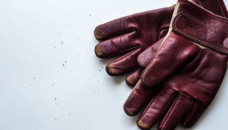 Minimalist white background with a pair of leather gloves, neatly placed side by side