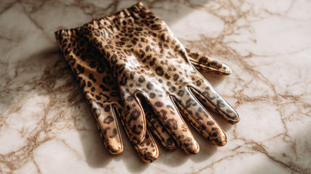 Animal print gloves are arranged neatly on a marble surface, highlighted by premium lighting. The setup is ideal for showcasing product details.