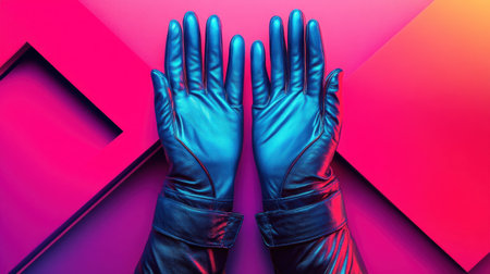 This captivating image features vibrant blue leather gloves placed against a bold geometric background with stunning neon colors, showcasing a unique fusion of fashion and art.