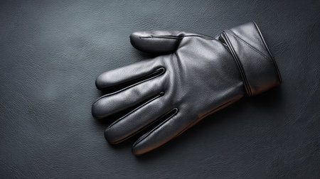 A stylish black leather glove rests elegantly on a dark textured surface, showcasing its sleek design and quality, perfect for winter fashion and accessory photography.