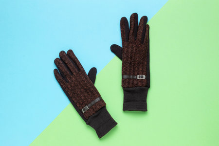 Fashionable Brown Winter Gloves on Colorful Geometric Background