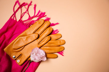 Leather gloves and wool scarf in autumn flat lay