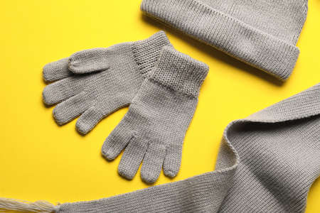 Warm gloves, hat and scarf on yellow background