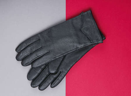 Leather gloves on a red-gray background. Top view